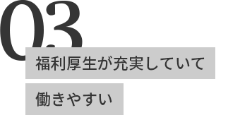 昇給・賞与・残業手当といった福利厚生が充実していることが、当方の強み。稀に土曜日出勤はありますが、基本は土日がお休み。その他当方の福利厚生での注目ポイントは、3年勤続してくださった方には退職金が出ること。
