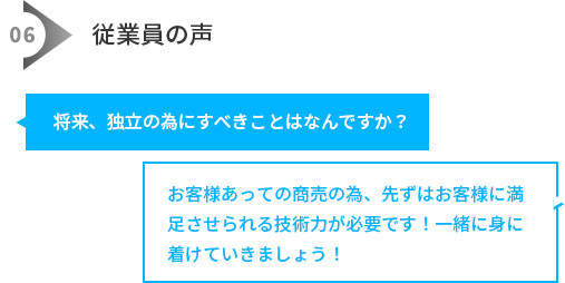 建築業界は人手不足の為、従業員が独立すると聞くと良い顔をしない会社もあると思います。ですが、RENO-BASEでは将来、独立を考えているという従業員に対し、安心して独立出来るように一人一人に支援をしています。 実際に独立をした際に経験したことや必要なこと、やっておくべきことなどを、代表の小野寺が自ら伝授します。